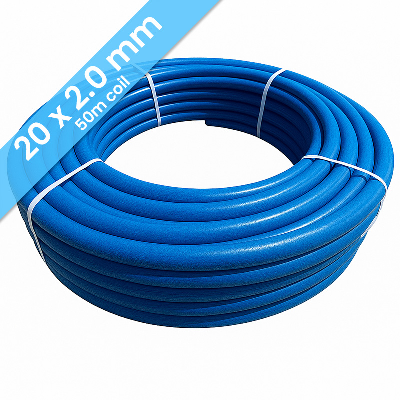 Kudos Trading pre-insulated blue 20mm x 2mm underfloor heating pipe, 50m coil, durable multilayer design for efficient water underfloor heating installations.