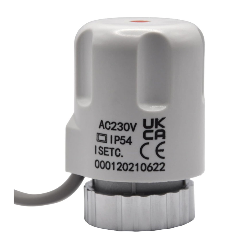 230v Underfloor Heating Actuator. Thermal Actuator 230v is normally closed. Compact Design, Easy to mount, Slim Design, IP54, 2 wire Config, M30 Thread. This high-quality actuator operates at 230 volts, providing reliable and precise control over your heating zones.