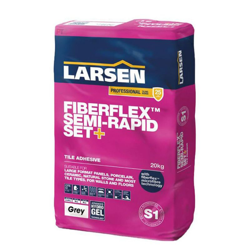 Larsen Professional FiberFlex™ Semi-Rapid Set+ (Pink Pro Bag) is a specially formulated, fully flexible, S1 rated, microfibre reinforced, non-slip, cement-based adhesive. It is suitable for large format panels, porcelain, ceramic, and natural stone tiles. It is suitable for beds of 3-20mm, interior, exterior, floor, and wall applications.