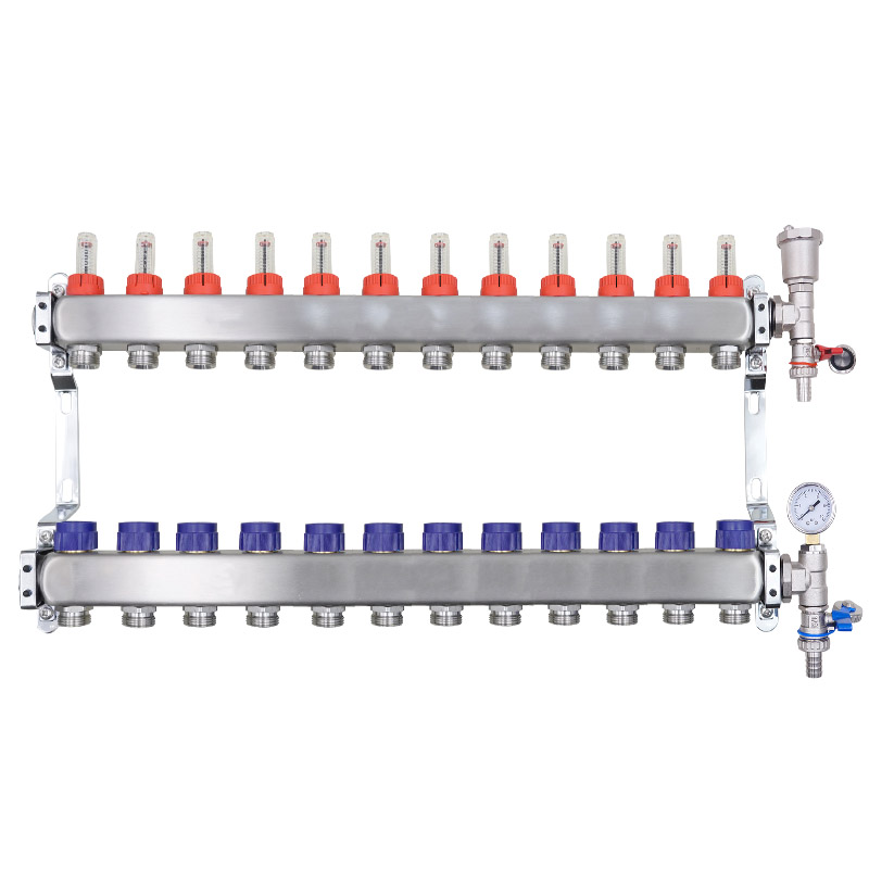 Underfloor Heating Manifold 12 Port Stainless Steel with Pressure Gauge & Auto Air Vent